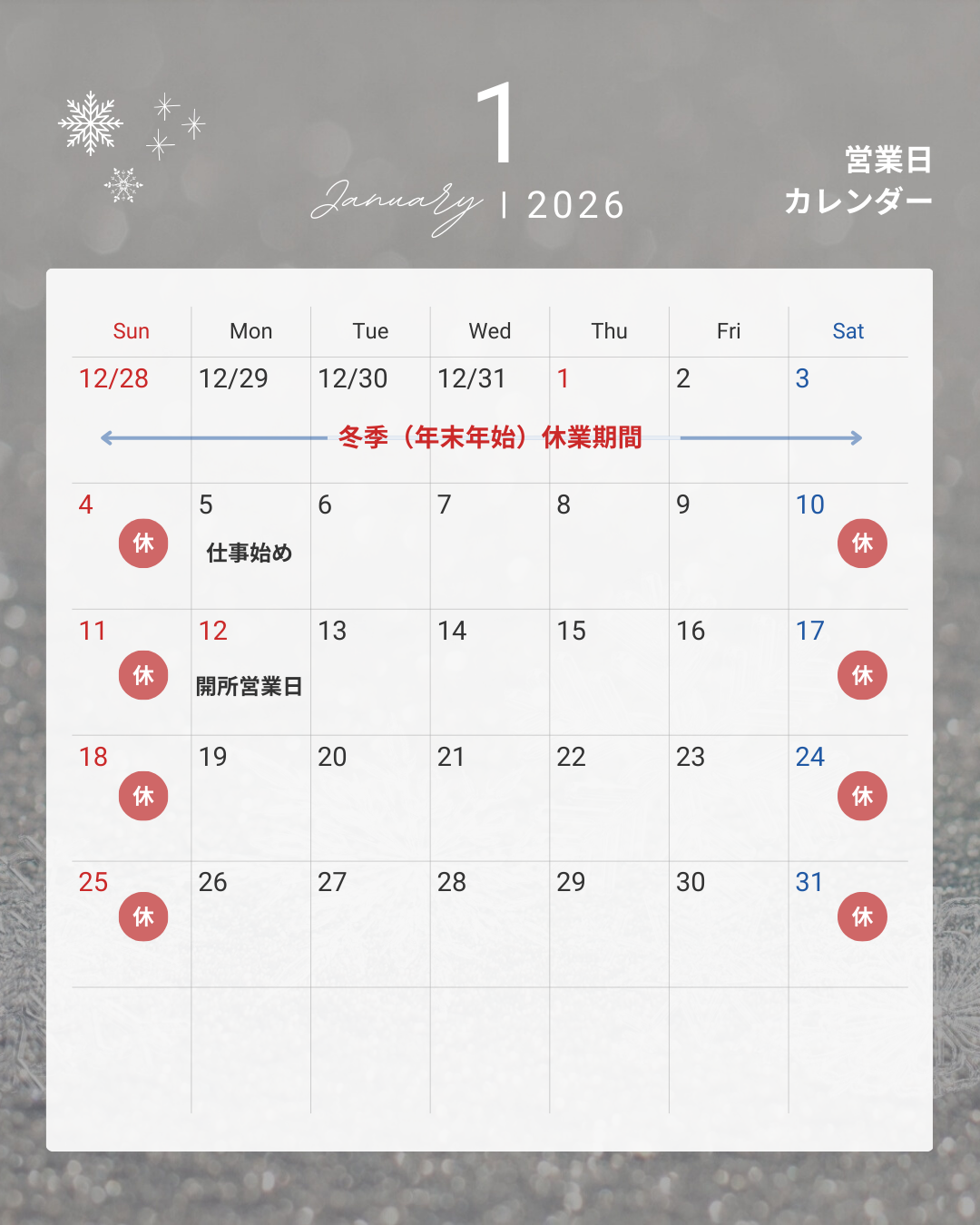 2026年1月営業日のお知らせ